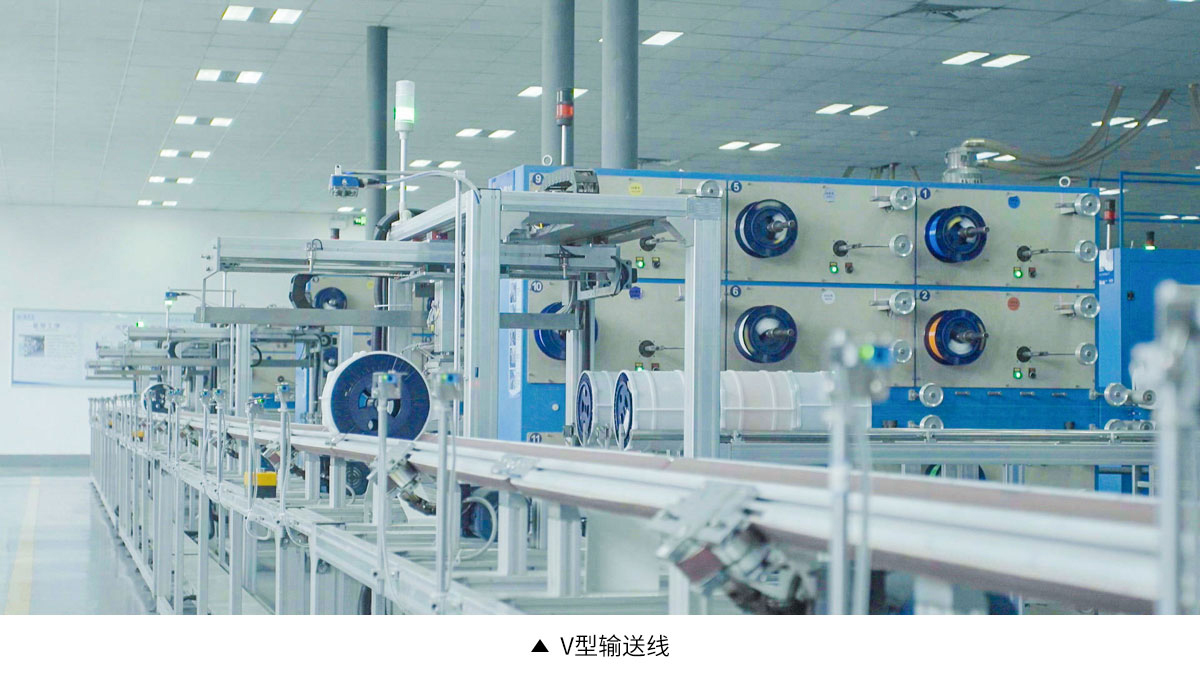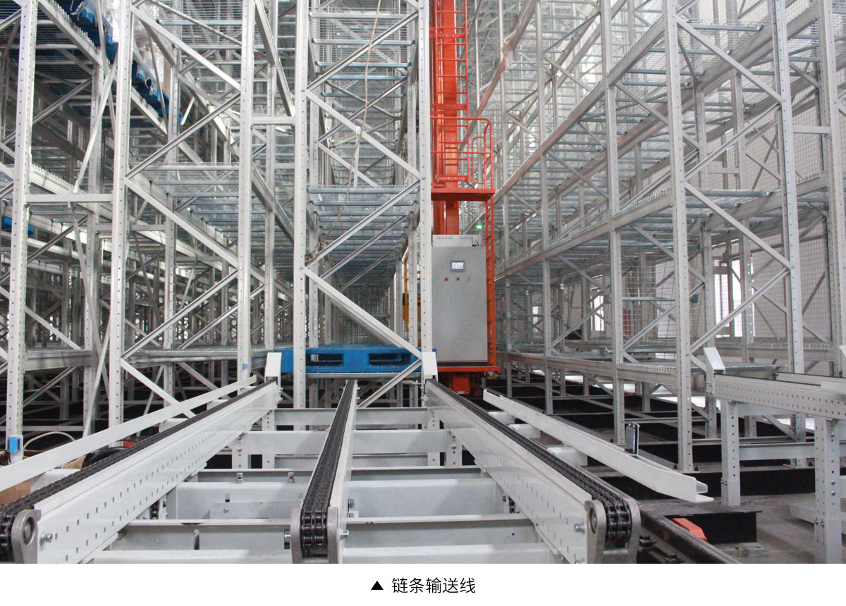 输送线主要是完成物料的输送任务。在环绕库房、生产车间和包装车间的场地,设置有由许多皮带输送线、滚筒输送线等组成的一条条输送链,经首尾连接形成连续的输送线。在物料的入口处和出口处设有和路径叉口装置、升降机和地面输送线。在仓库、生产车间和包装车间范围内形成既可顺畅到达各个生产位置同时又是封闭的循环输送线系统。