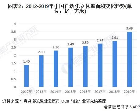 根据商务部流通业发展司数据显示,全国立体库面积从2012年底的1.40亿平方米增长至2017年的2.74亿平方米,2017、2018年我国新建自动化立体库均超过800座,截至2018年底,全国立体库面积约2.91亿平方米,保有量在5000座左右。GGII数据显示,2019年中国自动化立体仓库保有量6000座左右,根据立体库数量增长情况预测2019年立体库面积达到3.49亿立方米。其中,电商、快递、零售、冷链行业等服务领域需求增速明显较工业制造领域强劲,服装、新能源等新兴行业亦开始发力。