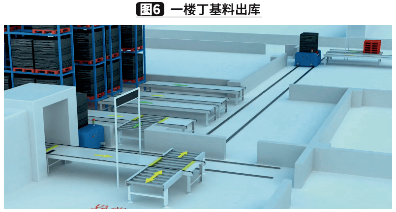 (3)一楼丁基料出库:系统下达出库指令,左库堆垛机将丁基料送至左库一楼右端的输送线上;通过输送线、RGV输送到右库一楼右端的输送线出口,显示屏提示出库信息;叉车根据显示屏信息下线出库,返回的空托盘回库;也可通过左库堆垛机将丁基料送至左库一楼左端的输送线上,RGV对接货物输送至出库输送线上,叉车叉取下线出库,返回的空托回库,出库作业完成。如图6。