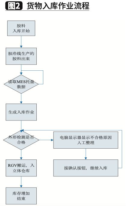 (1)一楼丁基料、无硫料入库:RGV将库内空托盘分别输送到8条胶冷线的终端(始终保持有空托盘待料),拆盘后进行收胶;胶冷线收胶后带有胶料信息的满托(胶料信息由MES系统写入RFID芯片),输送到外形检测工位,检测货物外形不合格,则发出警报,送异常整理口人工整理,人工整理后再入库,若二次外形检测仍不合格,则由RGV将货物送至异常下线口;异常整理口兼作不入库胶料的下线口;外形检测合格,由RGV送至巷道入库口的输送线上(其中丁基料全部入左库,无硫料由系统分配确定入左库或右库);货物到达堆垛机取货位后,堆垛机取货并送至系统指定的货架储位上(堆垛机上设置RFID阅读器实现入库货位分配、自动盘库、出库校验功能);计算机自动过账,入库作业完成。如图4。