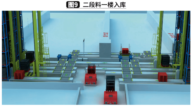 (6)一楼二段料通过右库堆垛机直接上二楼:叉车将二段料放到右库一楼的输送线上;发出物料输送请求;通过RGV、输送线、堆垛机将物料输送到二楼输送线上;AGV叉车取走物料。如图9、图10。