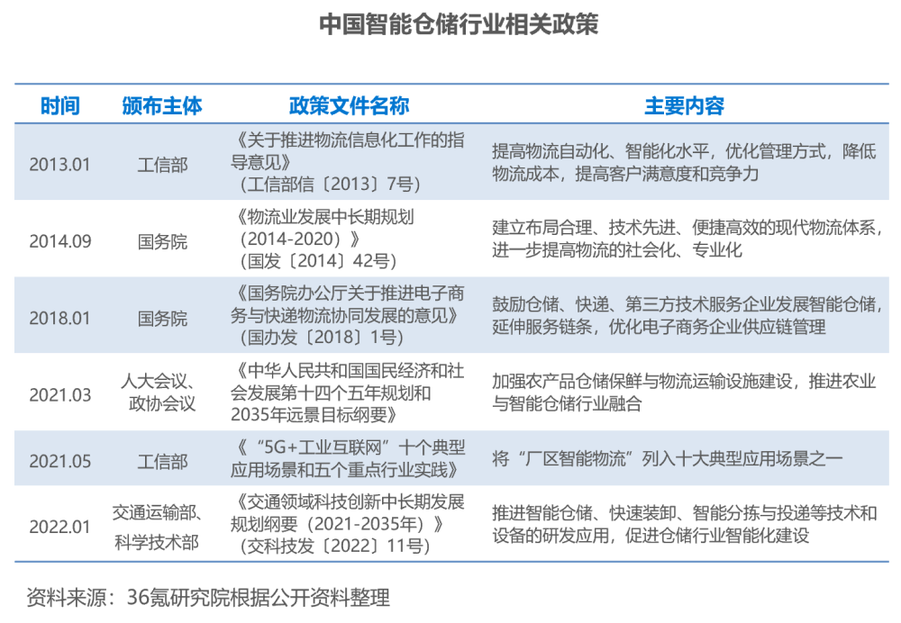 近年来,国家发改委、工信部、交通运输部等多个部委陆续出台政策,鼓励仓储环节智能化、自动化建设,促进物流行业降本增效。2013年工信部颁布的《关于推进物流信息化工作的指导意见》提出要提高物流行业自动化、智能化;2014年国务院制定的《物流业发展中长期规划(2014-2020)》为物流行业树立了更加明确的发展目标,即建设“布局合理、技术先进、便捷高效的现代物流体系”;2021年,工信部将“厂区智能物流”列入十大典型应用场景,并说明智能仓储具备降低仓储成本、提升运营效率、提升仓储管理能力的优势,是实现智能物流的关键要素;2022年,交通运输部与科学技术部联合印发《交通领域科技创新中长期发展规划纲要》,明确表明要推进仓储行业的智能化建设,为智能仓储领域发展提供进一步政策支持。总体而言,政策较少单一聚焦于智能仓储行业,一般依托智慧物流、现代物流进行宏观部署。政策颁布频次呈现增加趋势,对仓储行业的数字化水平要求也逐步提高。此外,政策不断推进智能仓储在制造业、农业、电商等领域中的应用,如利用智能仓储优化电子商务企业供应链管理,加强农产品仓储保鲜和冷链物流设施建设、推进农业与智能仓储行业深入融合等。