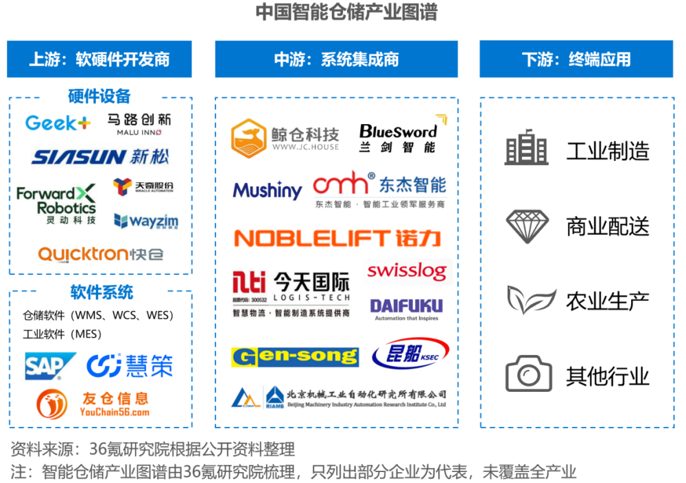 智能仓储产业链上游是软硬件开发商,中游是系统集成商,下游是工业制造、商业配送、农业生产等应用市场,已经形成较为完善的产业链条。