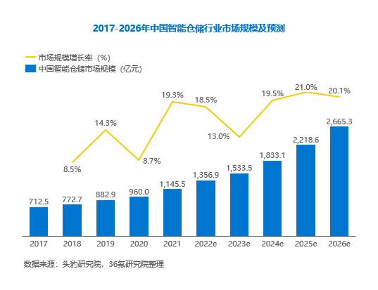 近年来,智能仓储的渗透率不断提升,市场规模不断扩大,从2017年的712.5亿元增长至2021年的1,145.5亿元,已突破千亿大关,年复合增长率达到12.6%。目前智能仓储行业还在起步阶段,整体融合发展需要时间沉淀,伴随技术迭代、政策利好、企业需求释放,未来智能仓储可以应用于更多行业和场景。根据头豹研究院预测,到2026年我国智能仓储市场规模有望达到2,665.3亿元,年复合增长率达到18.4%。